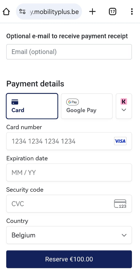 Fill out the payment card details (BC/MC, Mastercard, Visa,...) and tap Reserve €100,00.