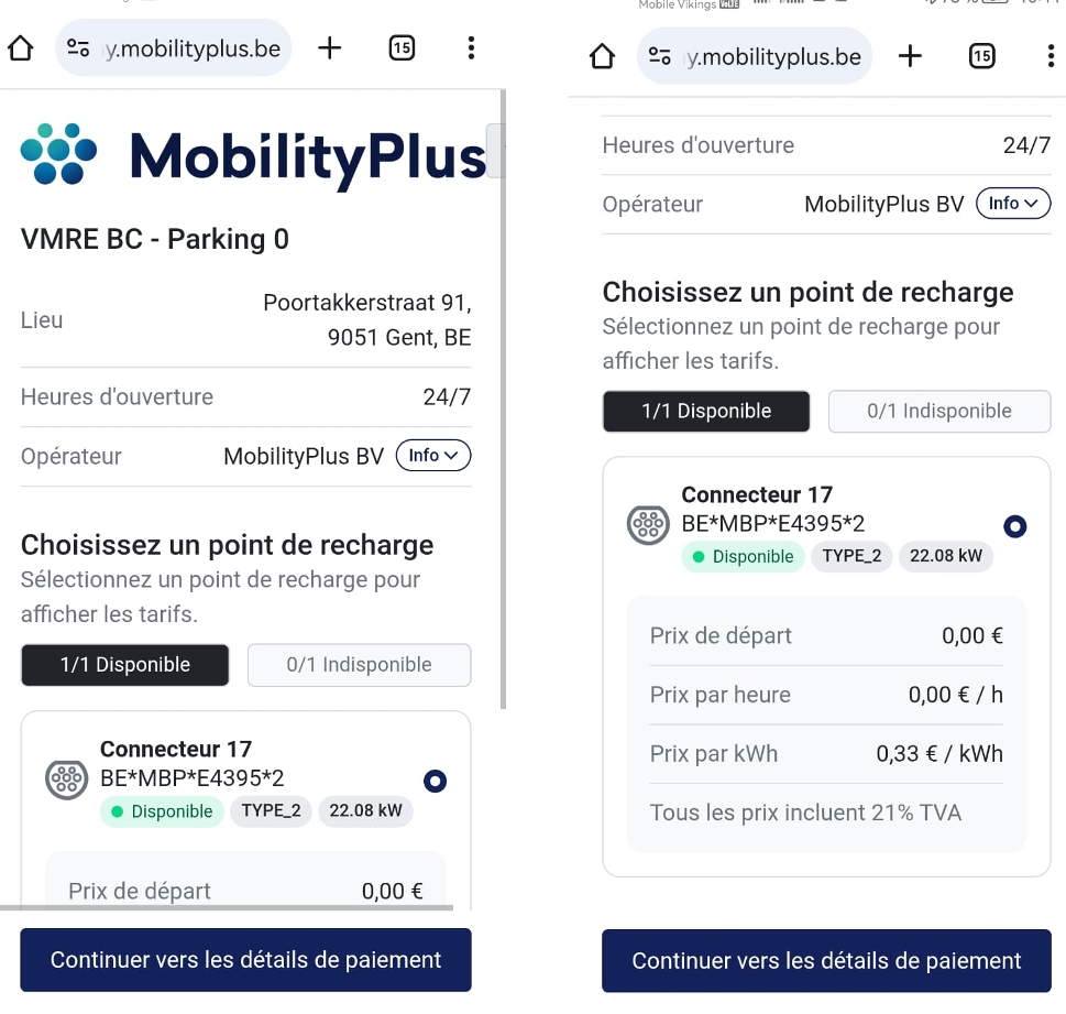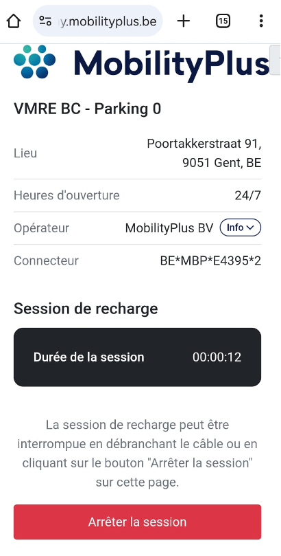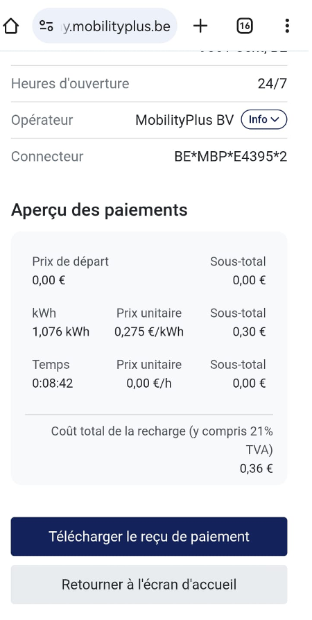 Le lieu, le connecteur et les tarifs de recharge (qui sont également visibles sur l'écran de la borne de recharge) s'affichent.
