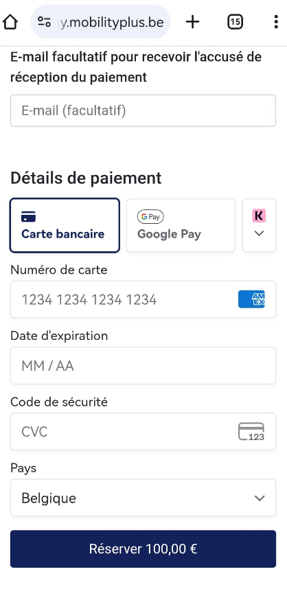 Saisissez les détails de la carte de paiement (BC/MC, Mastercard, Visa,...) et appuyez sur Réserver 100,00 €.
